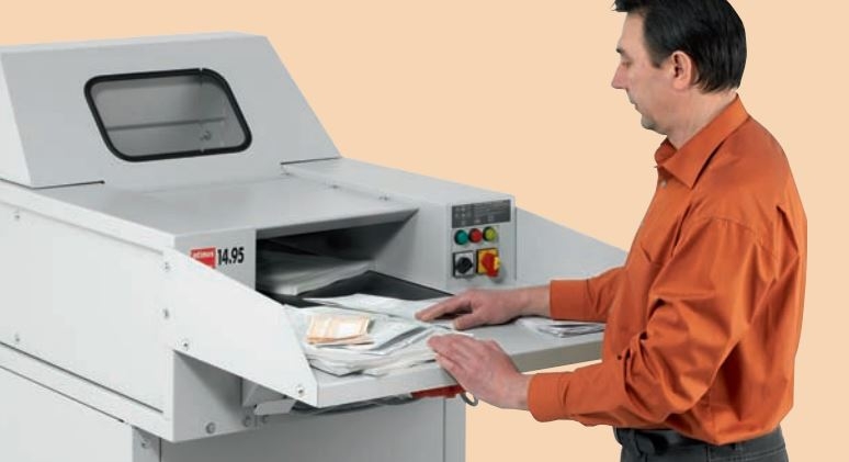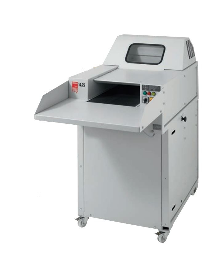 The 14.95 model commercial paper shredder has a unique paddle system in the conveyor feed channel that moves paper firmly into the cutting area. A large feed table allows for rapid loading by the user and with a lockable master switch, unauthorized or accidental power-ups are eliminated. The 14.95 is designed with advanced safety features to protect even the most inexperienced operator. With its wide 17-inch feed opening, the 14.95 can safely shred wide printouts, cartons, ribbons, cassettes, and even complete files with the folder and binders intact.